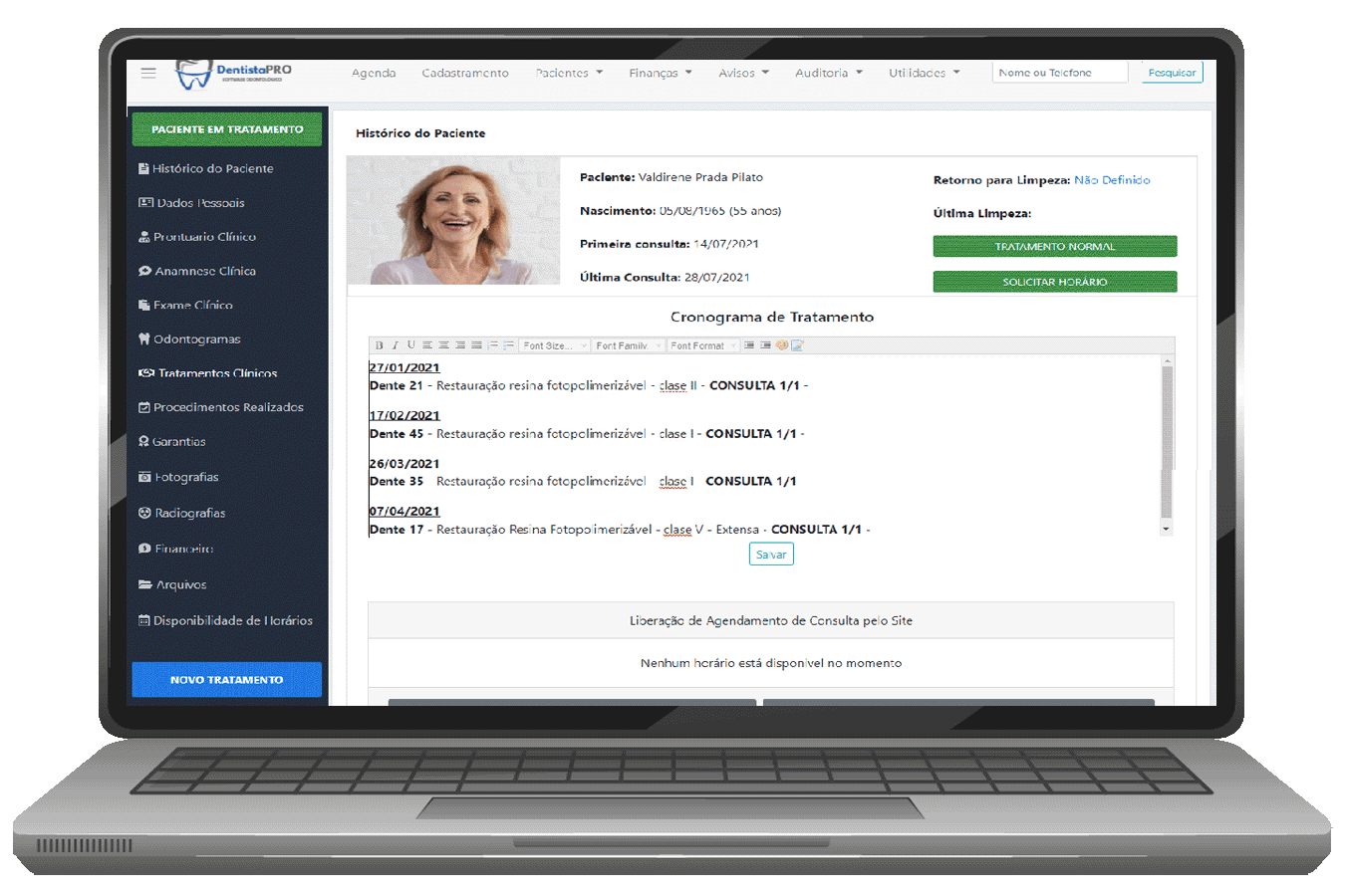 ✅ Histórico Clínico Completo – Visualize todos os atendimentos realizados, receituários prescritos, solicitações de exames, declarações de comparecimento e registros de trabalhos protéticos em um único lugar.